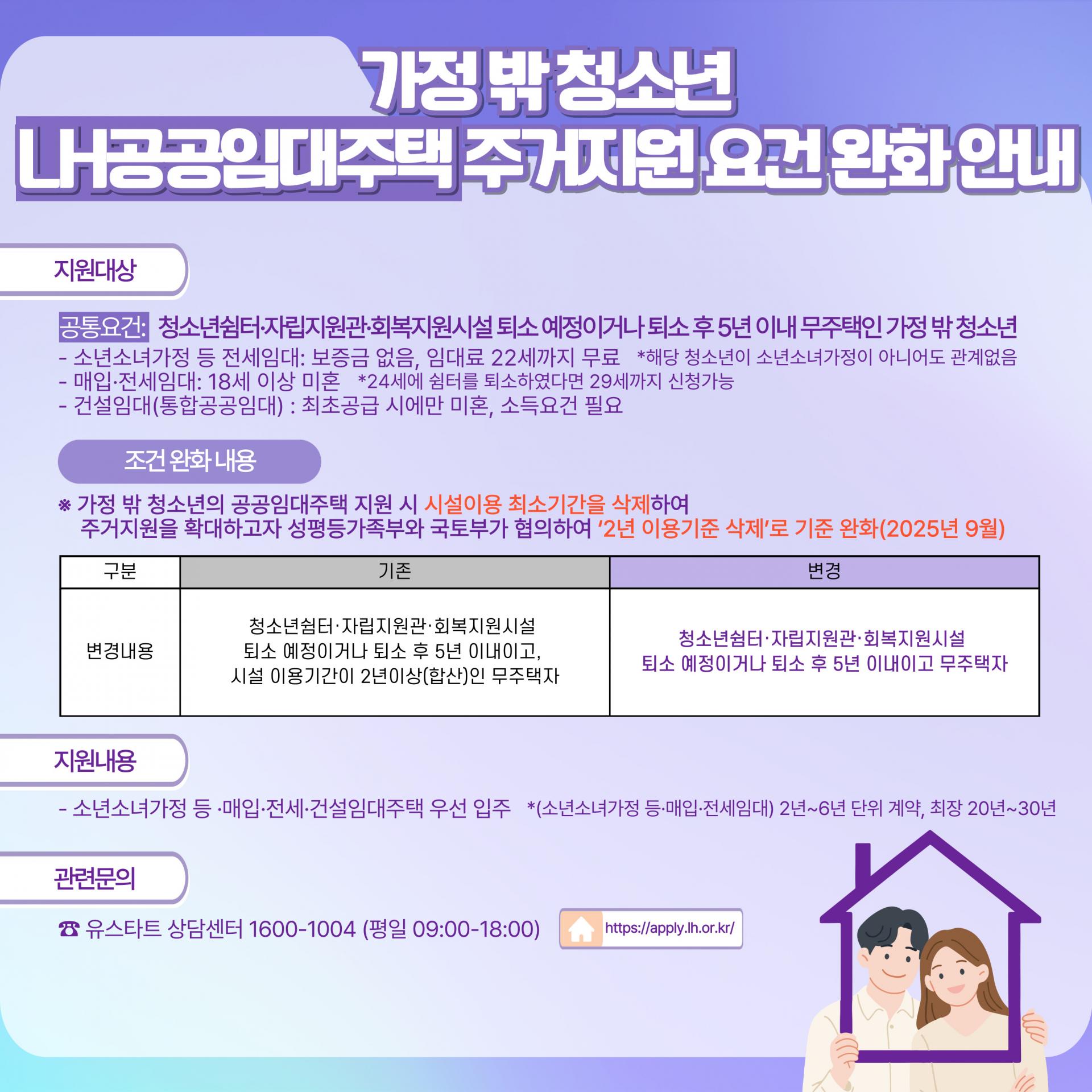 가정 밖 청소년의 공공임대주택 지원 시 시설이용 최소기간(2년)이 삭제되었습니다.